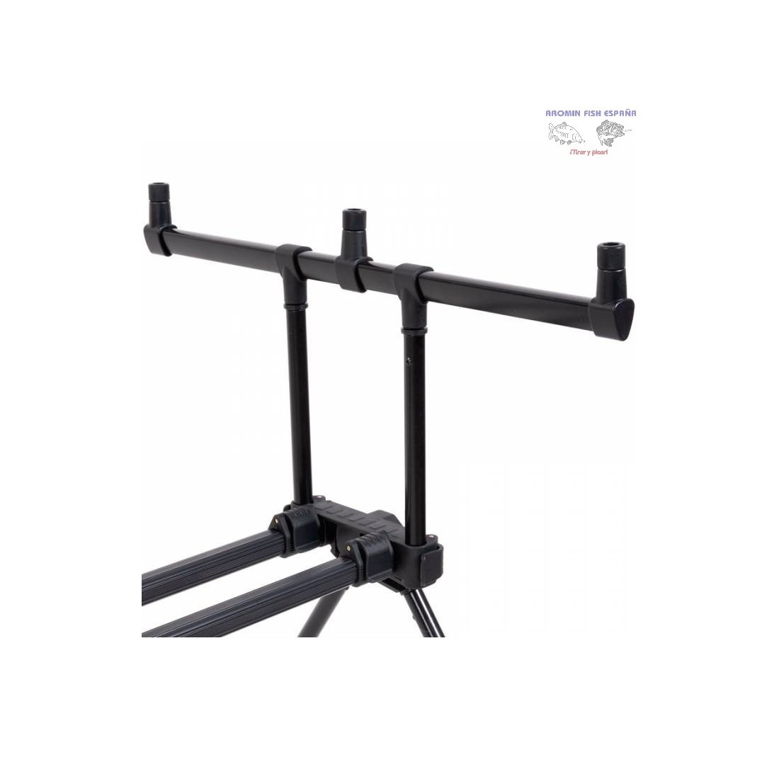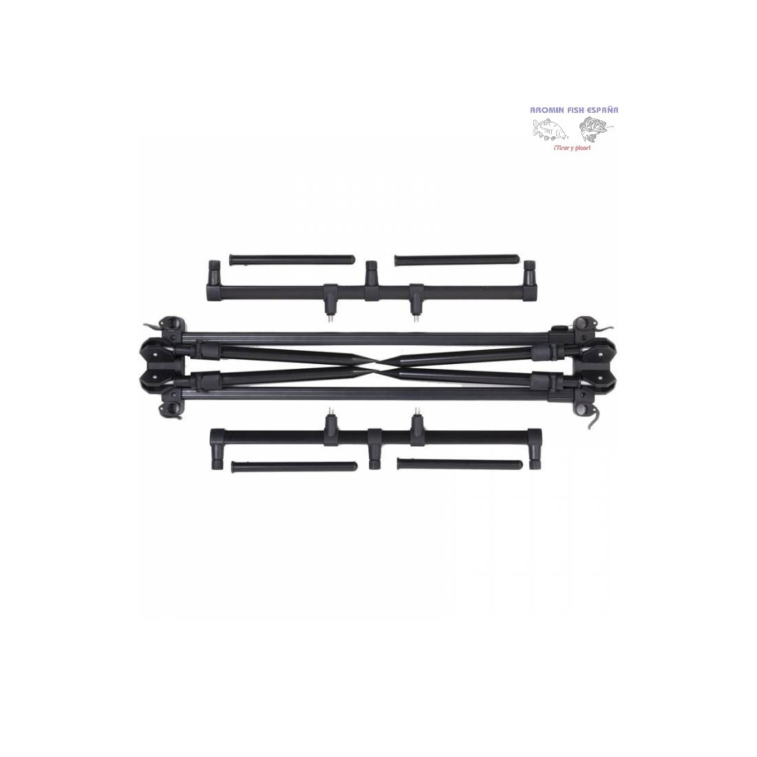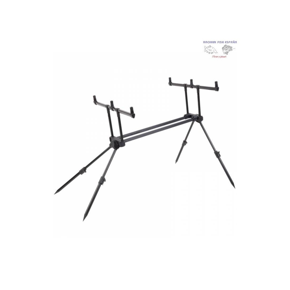Rod Pod Virux T-Light para tres cañas de pesca para la carpa. Económico y práctico. 2 buzzers de 50 cm cada uno. Longitud entre los dos buzzers: 120 cm. Patas fijas de 18 cm de altura en uno de los lados y 25 cm en el otro. Incluye funda de transporte.