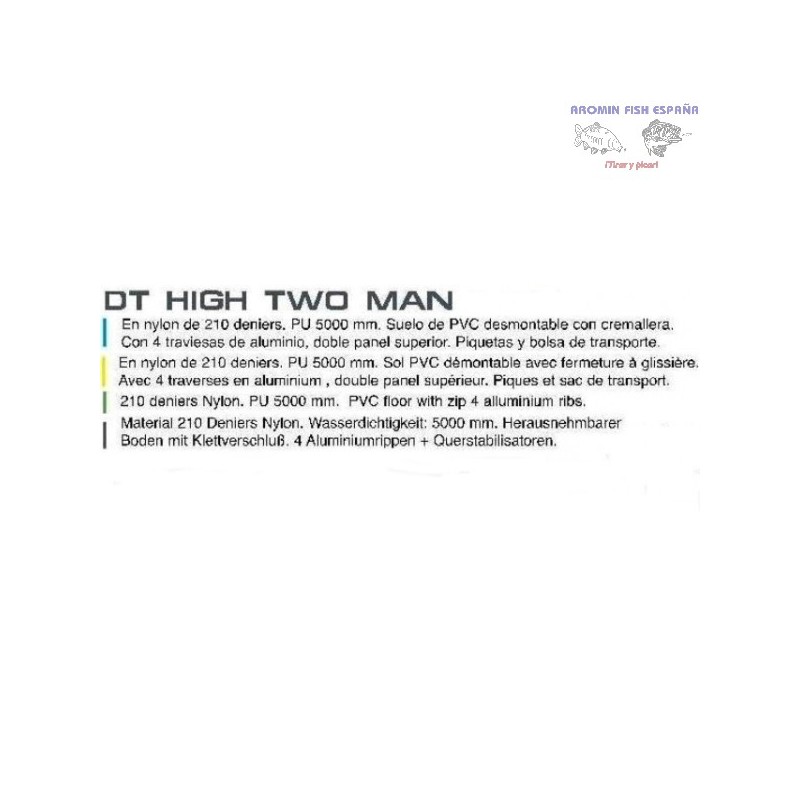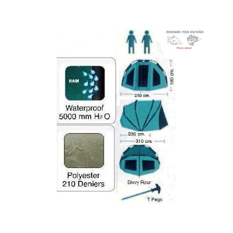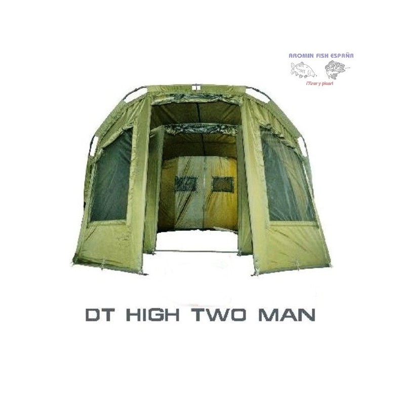 Vorteks DT Hight Two Man es el refugio perfecto para los pescadores de carpa. Equipado con suelo de PVC desmontable con cremalleras, estructura de tubo de aluminio y piquetas, fabricado con nylon/cordura de 210 deniards y resistente al agua 5000 mm HH. Capacidad para dos personas.