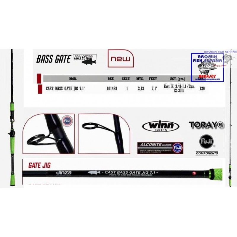 COLECCION FORMADA POR CAÑAS ESPECIFICAS PARA LA PESCA DEL BLACK BASS, EN ESTE CASO LA JINZA BASS GATE JIG 7'1"H., CAÑA DESTINADA A LA PESCA CON JIG, TAMBIEN VALIDA PARA TEXAS PLOMADO.