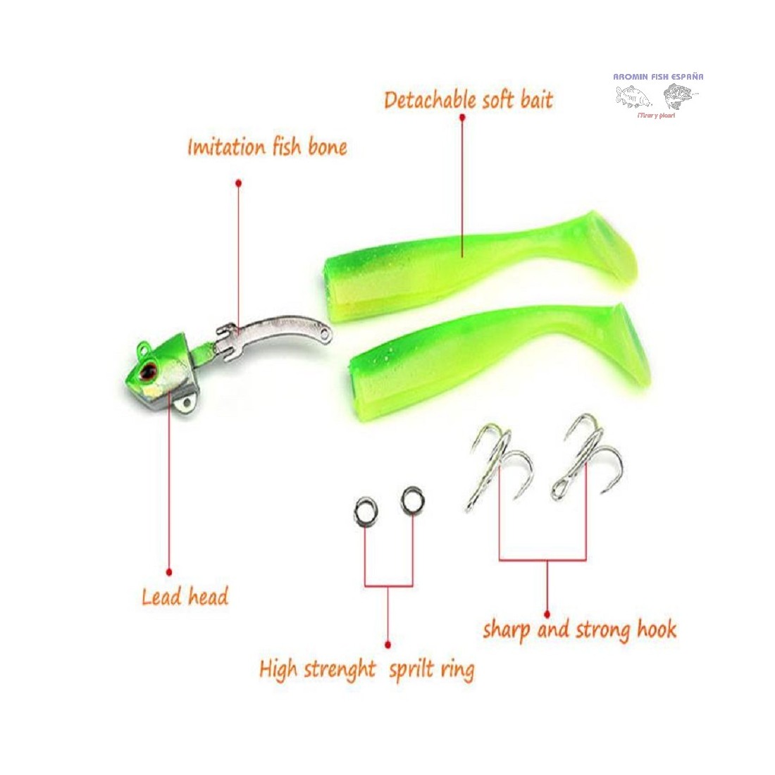 Contiene dos cuerpos y una cabeza plomada y accesorios para su montaje, como un par de anzuelos triples y anillas para su montaje.