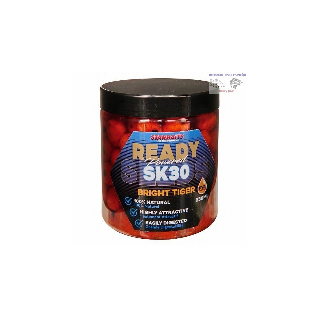 Serie de chufas preparadas Ready Seeds con aroma de SK 30 (calamar con krill) y una vistosa coloración naranja que destaca en el agua.