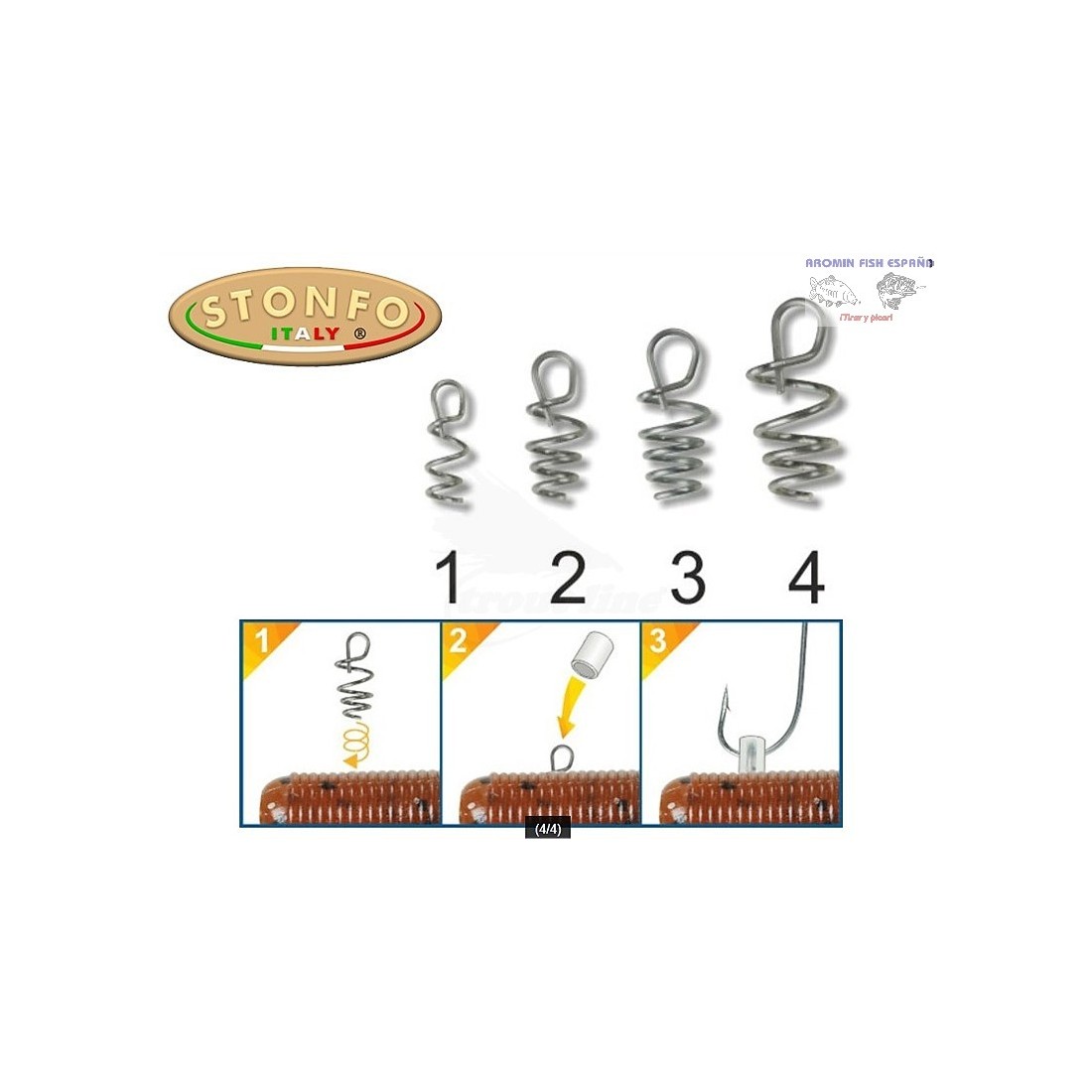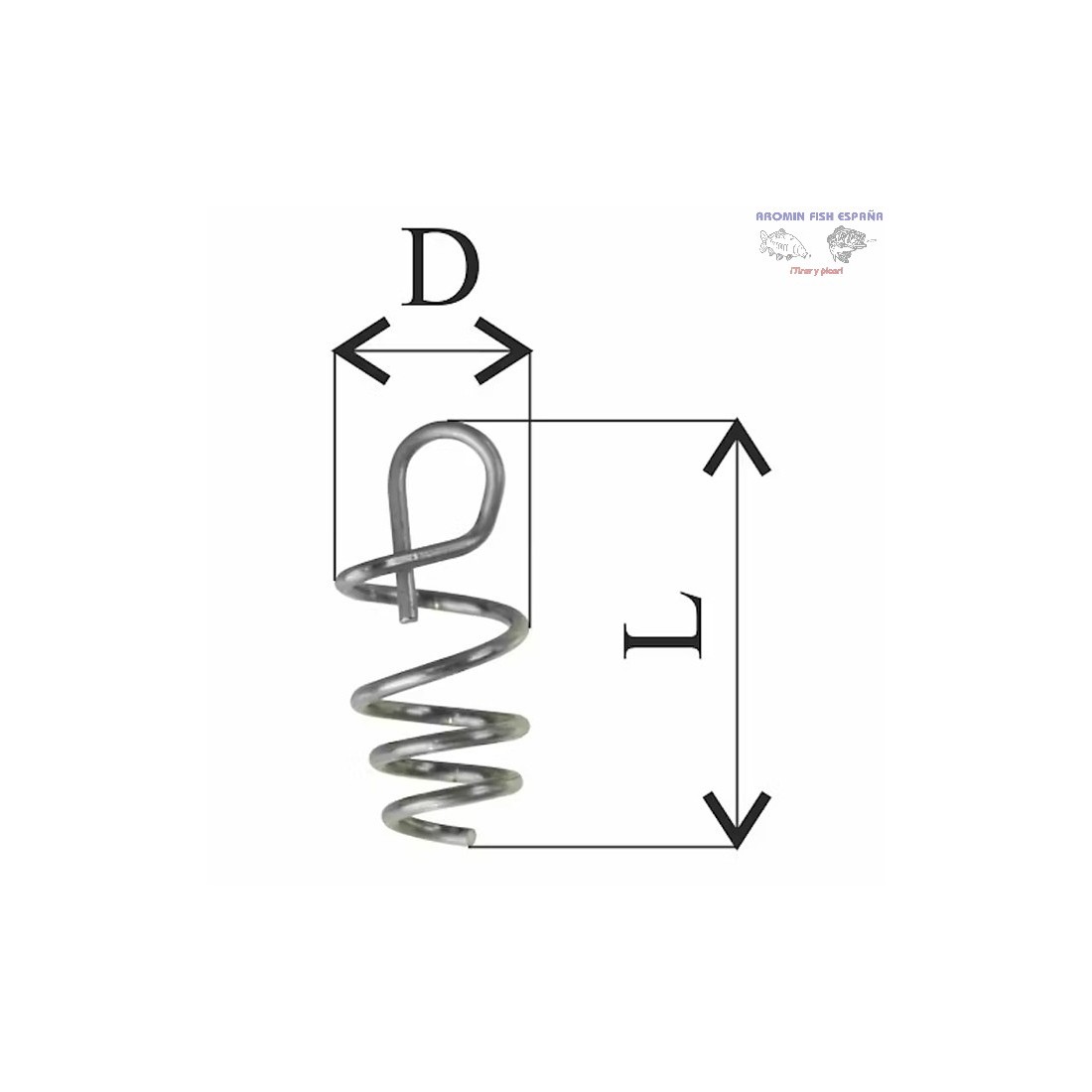 Muelles de acero inoxidable, fáciles de enroscar en el señuelo de silicona, permiten una fijación segura del anzuelo sin dañar el cebo. Ideal para Texas rig, Wacky rig y Neko rig. Muy útil para aplicar pesos, esferas atractoras o anzuelos adicionales en la posición deseada sobre el cebo.